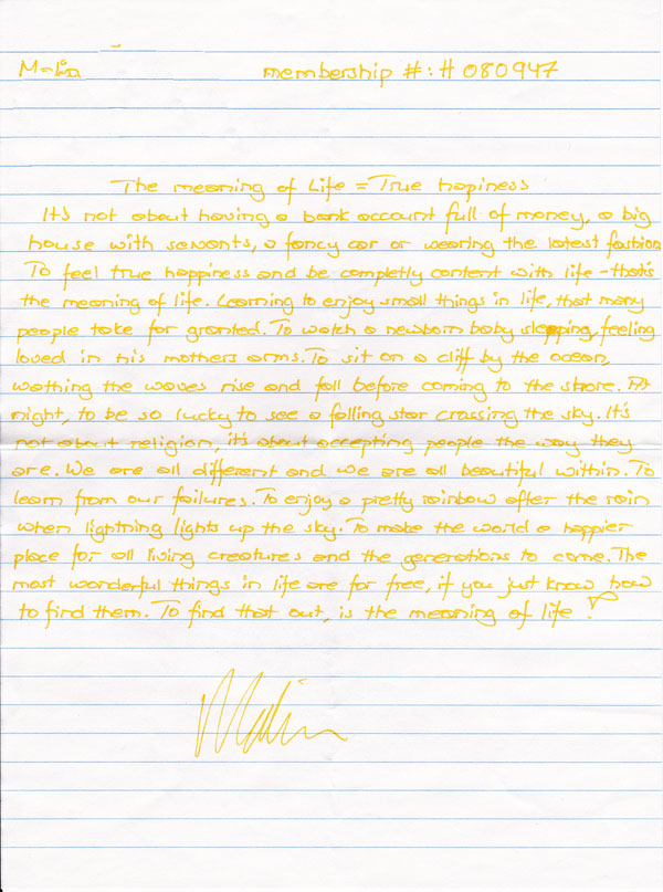 Its not about having a bank account full of money, big house with servants, a fancy car or wearing the latest fashion. To feel true happiness and be completely content with life - that is the meaning of life. Learning to enjoy small things in life, that many people take for granted. To watch a newborn baby sleeping, feeling loved in his mothers arms. To sit on a cliff by the ocean watching the waves rise and fall before comming to shore. At night, to be so lucky to see see a falling star crossing the sky. Its not about religion, its about accepting people the way they are. We are all different and we are all beautiful within. To learn from our failures. To enjoy a pretty rainbow after the rain when lightning lights up the sky. To make the world a happier place for all living creatures and the generations to come. The most wonderful things in life are for free, if you just know how to find them. To find that out, is the meaning of life.