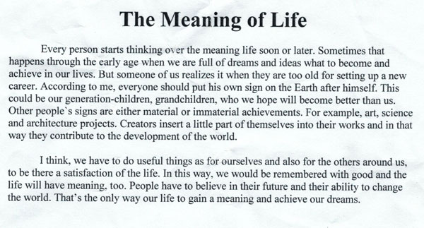 Every Person starts thinking over the meaning of life soon or later. Sometimes that happens through the early age when we are full of dreams and ideas what to become and achieve in our lives. But someone of us realises it when they are too old for setting up a new career. According to me, everyone should put his own sign on Earth after himself. This could be our generation-children, grandchildren, who we hope will become better than us. Other people's signs are either material or immaterial achievements. For example, art, science and architecture projects. Creators insert a little part of themselves into their works and in that way they contribute to the development of the world. I think, we have to do useful as for ourselves and also for the others around us, to be there a satisfaction of the life. In this way, we would be remembered with good and the life will have meaning, too. People have to believe in the future and their ability to change the world. Thats the only way our life to gain a meaning and achieve our dreams.