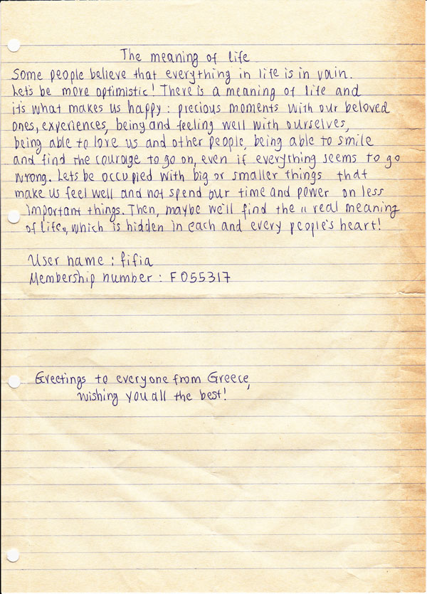 Some people believe that everything in life is in vain. Lets be more optimistic! There is a meaning of life and its what makes us happy: precious moments with our beloved ones, experiences, being and feeling well with ourselves, being able to love us and other people, being able to smile and find courage to go on, even if everything seems to go wrong. Lets be occupied with big or smaller things that makes us feel well and not spend our time and power on less important things. Then, maybe we'll find the "meaning of life", which is hidden in each and every peoples heart!