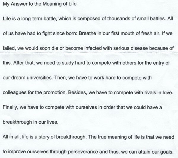Life is a longterm battle, which is composed of thousands of small battles. All of us have had to fight sice born: Breathe in our first mouth of fresh air. If we failed, we would soon die or become infected with serious disease because of this. After that, we need tostydy hard to compete with others for the entry of our dream universities. Then, we have to work hard to compte with colleagues for the promotion. Besides, we have to with rivals in love. Finally, we have to compete with ourselves in order that we couldhave a breakthrough in our lives. All in all, life is a story of breakthrough. The true meaning of life isthat we need to improve ourselves thorugh perseverance and thus, we can attain our goals.