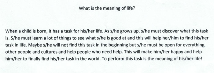 When a child is born, it has a task for his/her life. As they grow up, they must discover what this task is. They must learn a lot of things to see what they are good at and this will help them to find their task in life. Maybe they will not find this task in the beginning but they must be open for everything, other people and cultures and help people who need help. This will make them happy and help them to finally find their task in the world. To perform this task is the meaning of their life!
