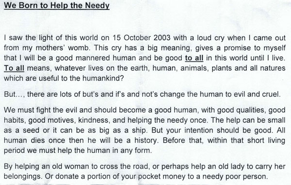 I saw the light of this world on 15 October 2003 with a loud cry when i came out from my mothers womb. This cry has a big meaning, gives a promise to myself that I will be a good mannered human and be good to all in this world until I live.