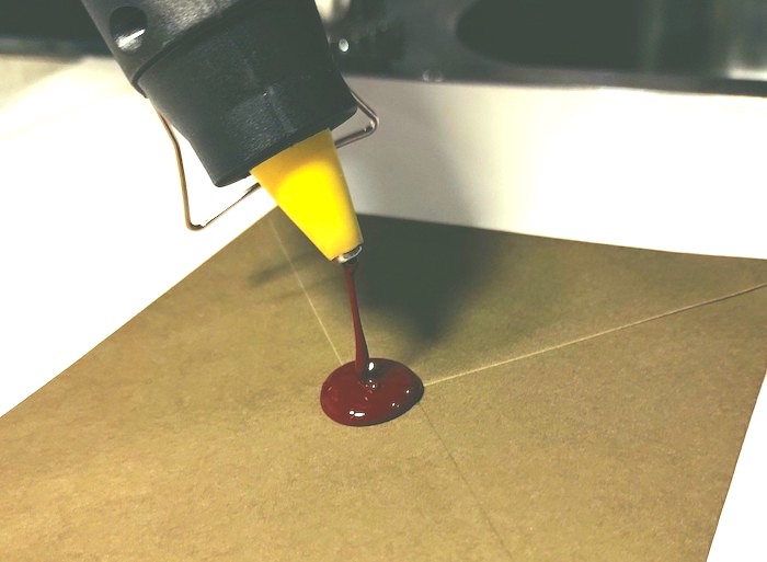 For this method, you must use cylindrical wax sticks designed for a glue gun. This method is extremely easy if using a single wax colour. The wax is placed in the glue gun and once it is hot enough, you can begin to depress the gun and drip wax directly onto your envelope. The wax comes out quite runny and you may need to wait 20 seconds prior to depressing the stamp to ensure a good seal.