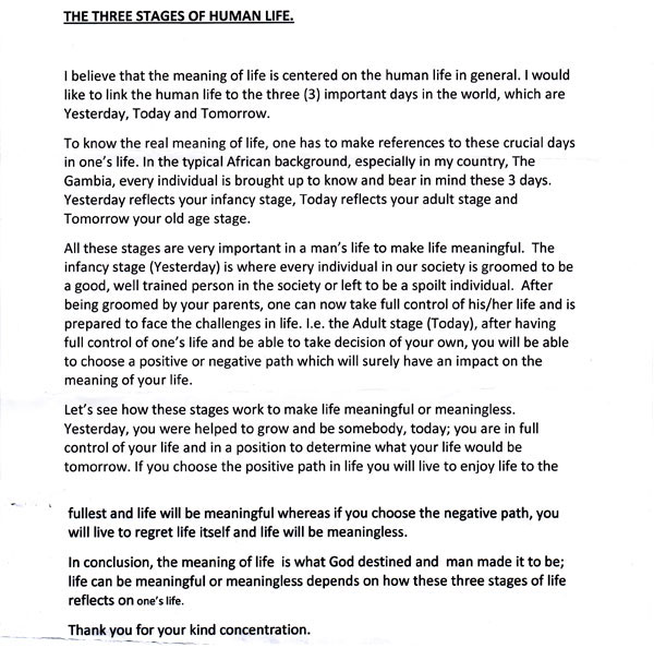 To know the real meaning of life, one has to make references to these crutial days in one's life. In the typical African background, especially in my country, The Gambia, every individual is brought up to know and bear in mind these 3 days. Yesterday reflects your infancy stage, Today reflects your adult stage and Tomorrow your old age stage.
