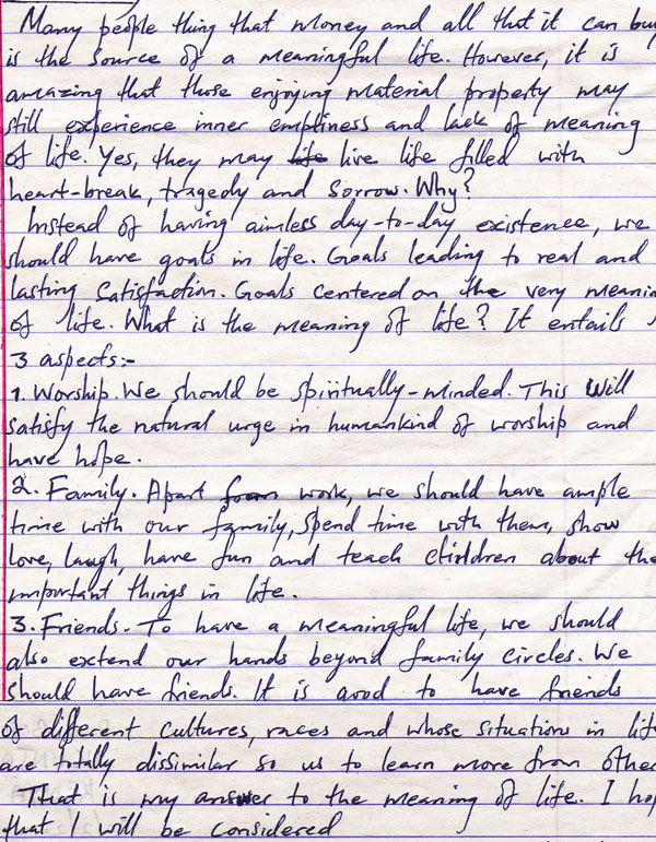 3. Friends - To have a meaningful life, we should also extend our hands beyond family circles. We should have friends. It is good to have friends of different cultures, races and whose situations in life are totally dissimilar so as to learn more from others. That is my answer to the meaning of life.