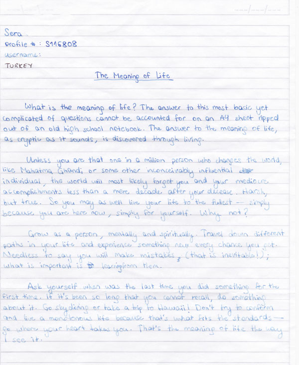 What is the meaning of life? The answer to this most basic yet complicated of questions cannot be accounted for on an A4 sheet ripped out of an old high school notebook. The answer to the meaning of life, as cryptic as it sounds, is discovered through living.