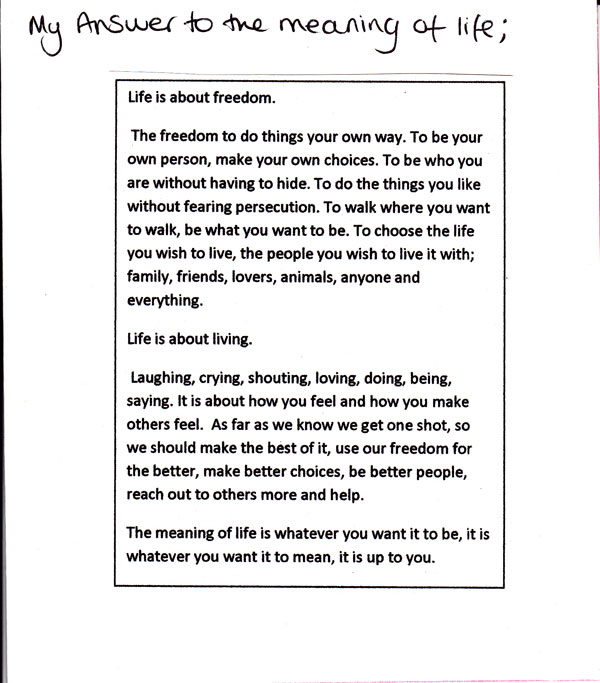 Life is about living. Laughing, crying, shouting, loving, doing, being, saying. It is about how you feel and how you make others feel. As far as we know we get one shot, so we whould make the best of it, use our freedom for the better, make better choices, be better people, reach out to others more and help.